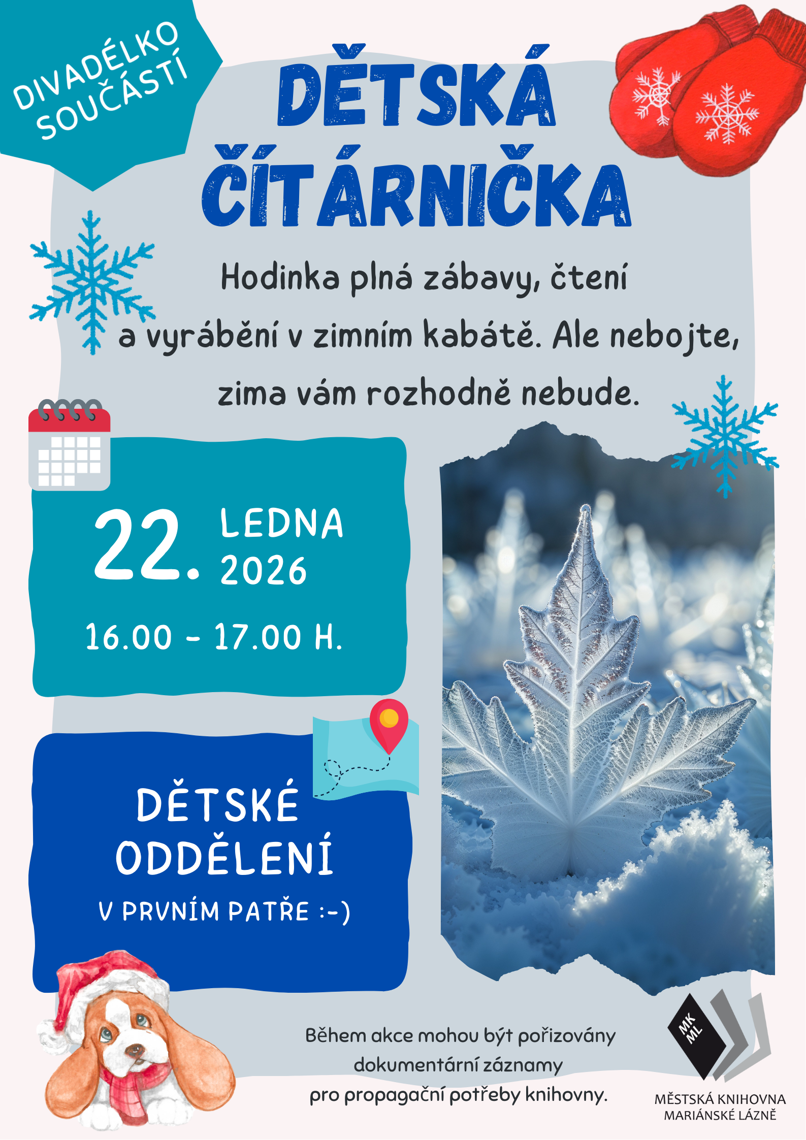 Hodinka plná zábavy, čtení, vyrábění a divadla v zimním kabátě v dětském oddělení knihovny. Ideální pro předškoláky a malé školáky.