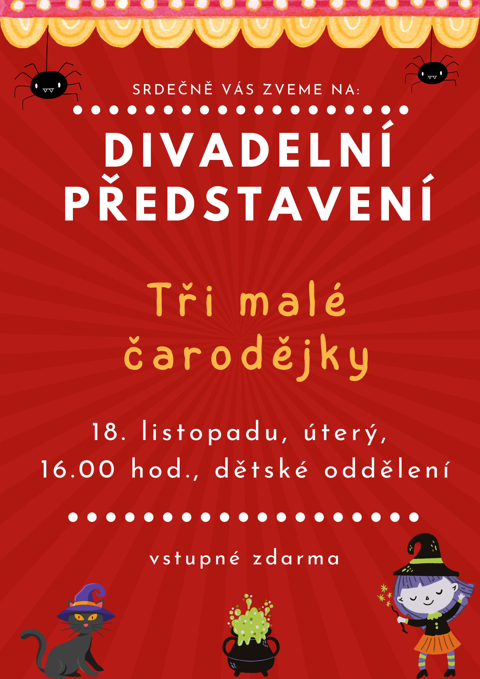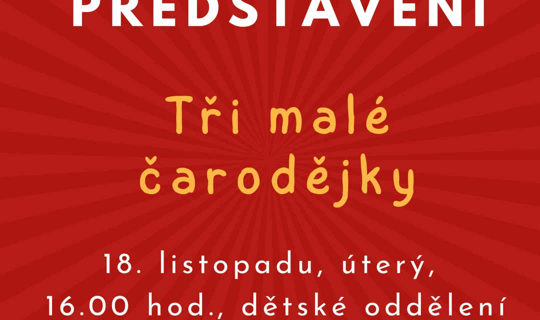 Krátké divadélko Tři malé čarodějnice pro děti v dětském oddělení městské knihovny, v úterý, 18. listopadu od 16:00 hod.