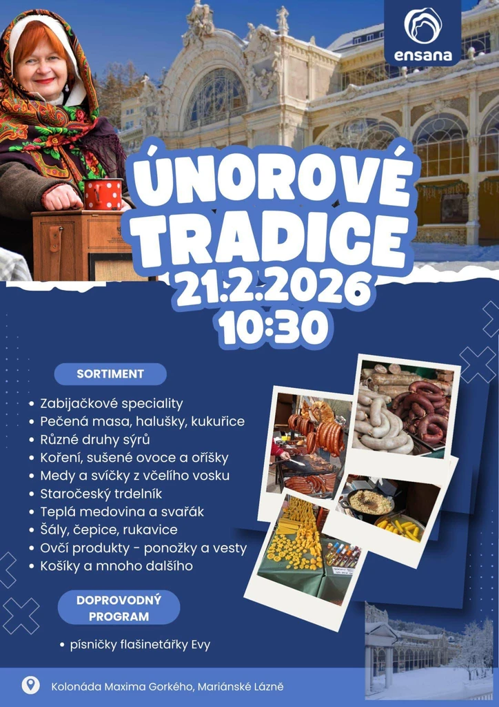 Únorové tradice na lázeňské kolonádě města Mariánské Lázně je v rámci čtvrtého ročníku snahou o návrat k tradicím. Malý jarmark tradičních řemesel a pochutin v prostorách lázeňské kolonády. Doprovodný program zpříjemní písničky flašinetářky Evy, které dodají celé akci tu pravou nostalgickou atmosféru.