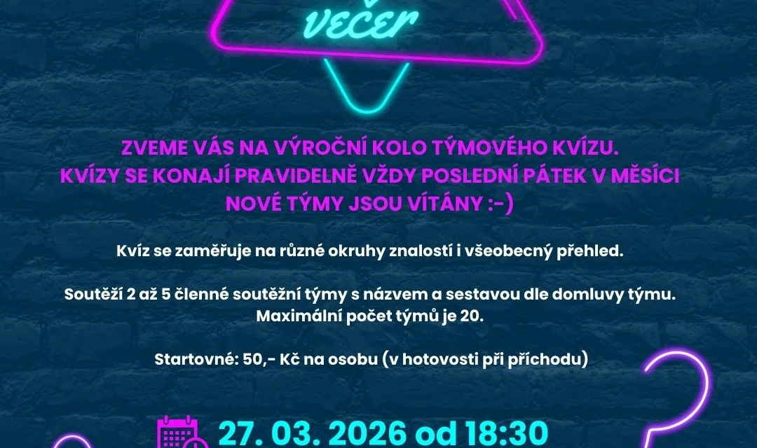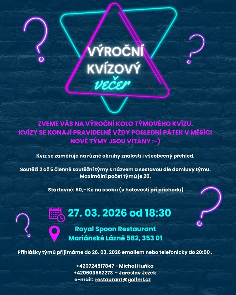 Máte rádi zábavu, soutěžení a dobré jídlo? Přijďte si užít skvělý večer plný otázek, napětí a týmové spolupráce. Pátek 27. 03. 2026 od 18:30 Royal Spoon Restaurant, Mariánské Lázně. Zveme všechny stávající i nové týmy. Týmy o 2–5 hráčích. Čeká vás mix témat a všeobecný přehled. Startovné: 50 Kč / osoba.