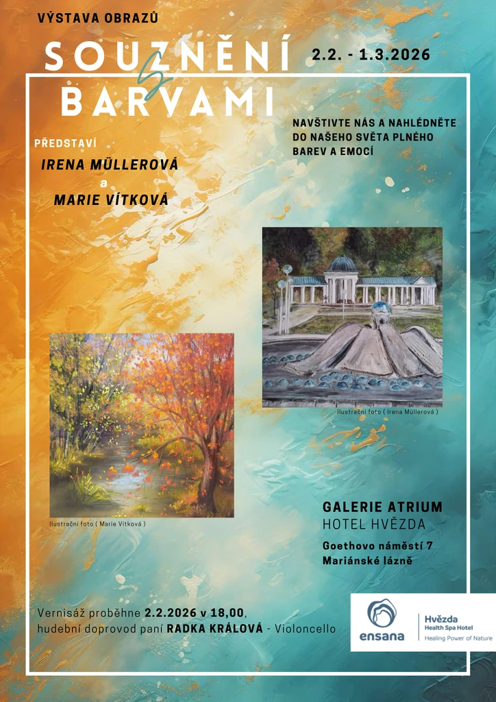 Srdečně vás zveme k návštěvě obrazové výstavy autorek Ireny Müllerové a Marie Vítkové s názvem „Souznění s barvami“. Výstava se koná v atriu hotelu Hvězda.