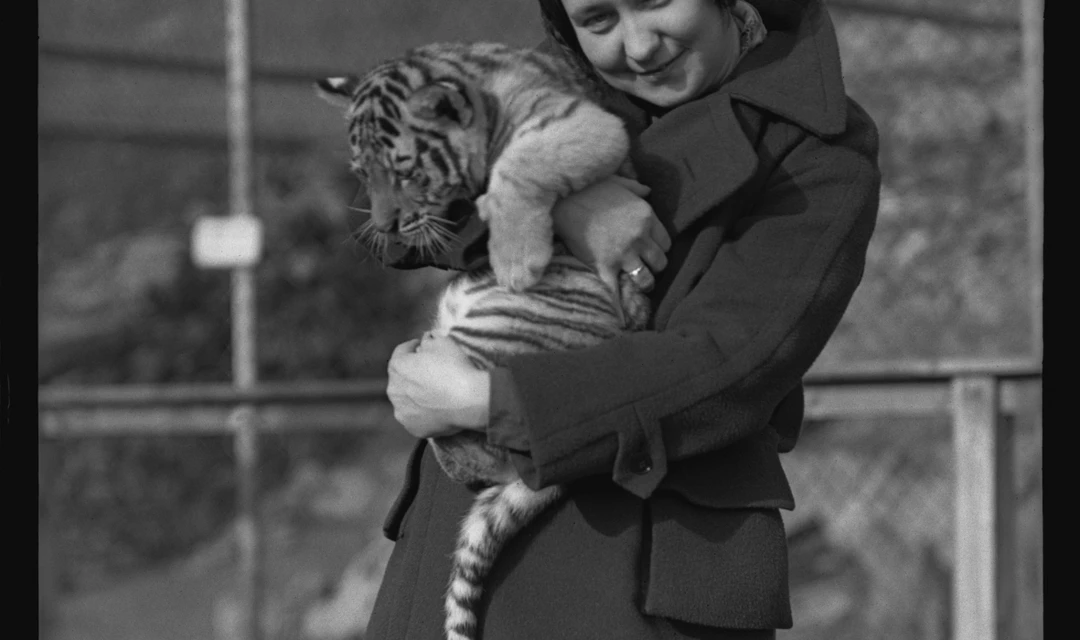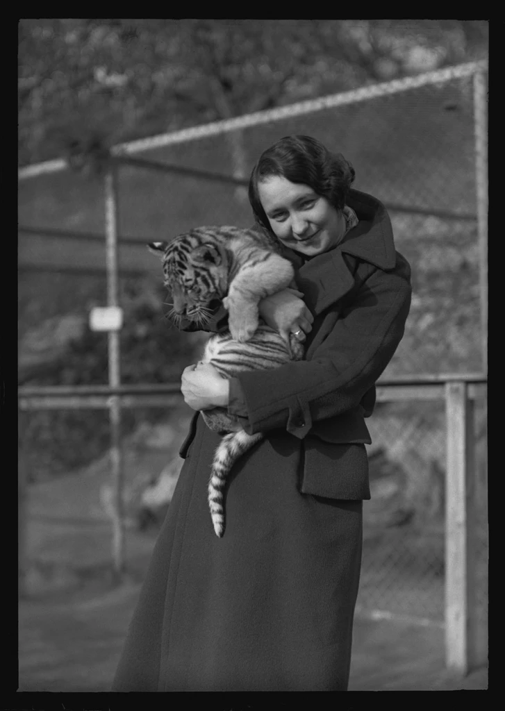 Choť cestovatele a muzejníka Jiřího Bauma s tygřím mládětem v pražské zoologické zahradě, foto J. Baum, Archiv Národního muzea, 10. 11. 1934